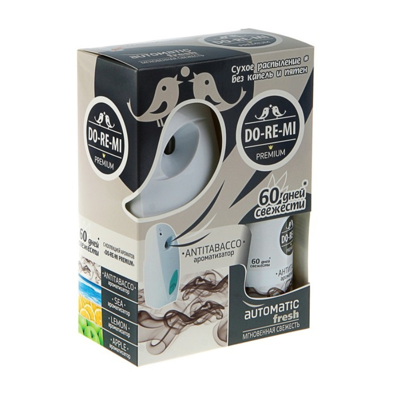Автоматический диспенсер + 2 батарейки. В комплект "До-ре-ми" Премиум входит диспенсер и автоматический освежитель воздуха. Комплект освежителя воздуха До-Ре-Ми прекрасно освежит ваш дом от неприятных запахов. Автоматическое распыление без капель и пятен. Свежесть до 60 дней.