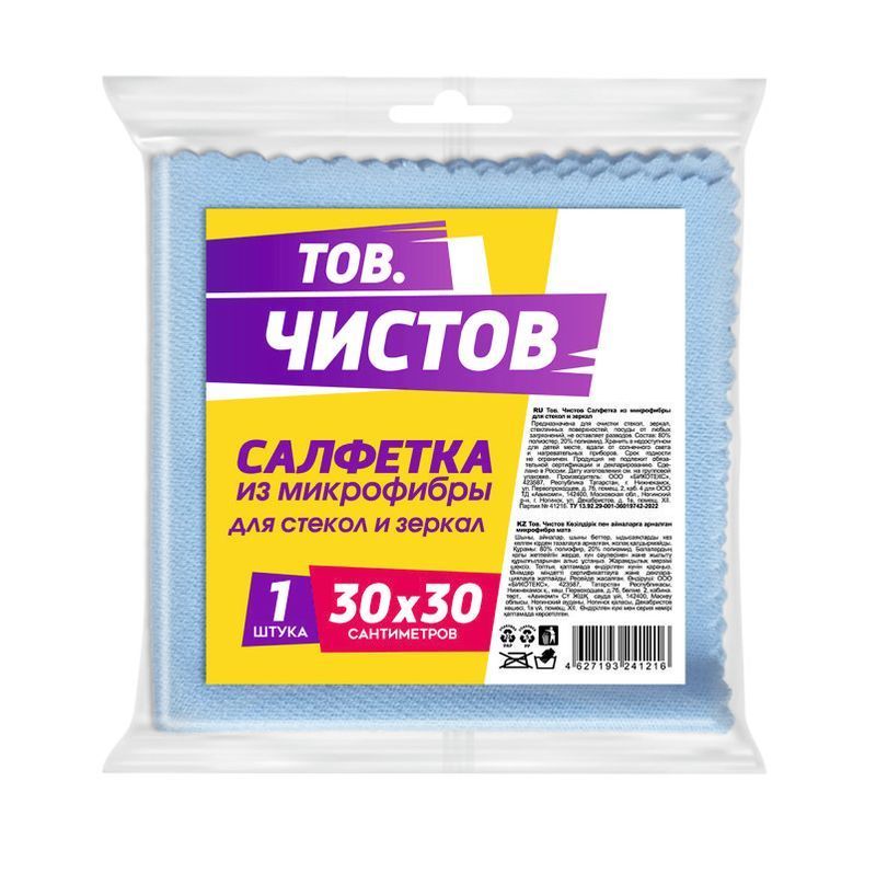 Тов. Чистов Салфетка из микрофибры для стекол и зеркал, 30х30см, (1шт) 41216 Avikomp