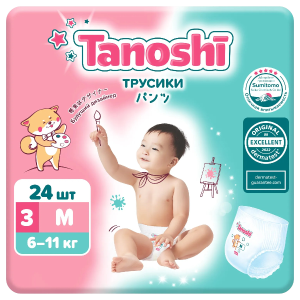 Ультратонкие и дышащие детские трусики-подгузники Tanoshi (Таноши) для малышей с весом 6-11 кг – ультратонкие, как хлопковое бельё, и мягкие одноразовые трусики. Они не стесняют движения непоседы, который активно ползает и делает первые шаги. Tanoshi – лучший выбор родителей, для которых важны доказанное качество и справедливая цена.