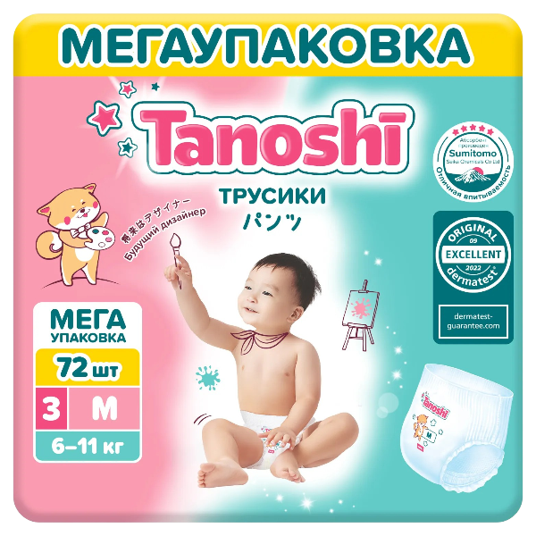 Ультратонкие и дышащие детские трусики-подгузники Tanoshi (Таноши) для малышей с весом 6-11 кг – ультратонкие, как хлопковое бельё, и мягкие одноразовые трусики. Они не стесняют движения непоседы, который активно ползает и делает первые шаги. Tanoshi – лучший выбор родителей, для которых важны доказанное качество и справедливая цена.