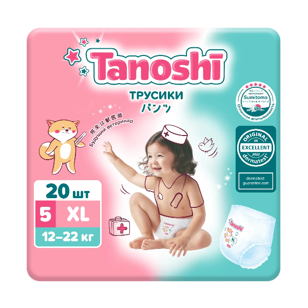 Ультратонкие и дышащие детские трусики-подгузники Tanoshi (Таноши) для малышей с весом 12-22 кг – ультратонкие, как хлопковое бельё, и мягкие одноразовые трусики. Они не стесняют движения непоседы, который активно ползает и делает первые шаги. Tanoshi – лучший выбор родителей, для которых важны доказанное качество и справедливая цена.