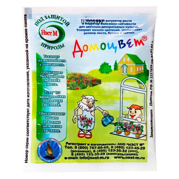 Домоцвет (0,05г/л гидроксикоричных кислот) - регулятор роста повышающий декоративность однолетних, многолетних, комнатных цветочных культур и крупных многолетних цветочно-декоративных кустарников ( сирень, жасмин, рододендрон, гортензия, миндаль, лапчатка и др.) открытого и защищенного грунта.